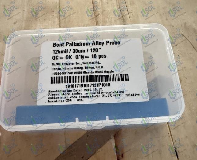 Set of 10 Bent Palladium Alloy Probe Tips, designed for high-precision semiconductor testing and micro-probing. Unlike standard tips, the Palladium Alloy construction offers superior contact resistance and is ideal for applications where oxidation must be minimized. These probes feature a 120-degree bend and a precision 30-micron (30um) tip radius, ensuring stable and accurate electrical contact.