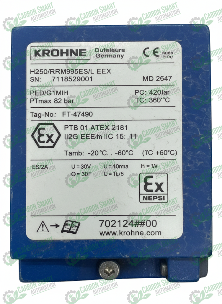 Krohne H250/RR/M9/ESK-EEx is a robust variable area flowmeter (rotameter) designed for reliable flow measurement in industrial and hazardous-area applications. This unit features stainless steel (SS) process fittings, providing excellent corrosion resistance and long service life in demanding environments. Identified with Tag No. FT-47490 and compliant with PED/G1/II/H, it ensures safe and accurate operation within regulated process systems. Built on the proven Krohne H250 platform, this flow meter is ideal for chemical, oil & gas, power, and general industrial flow monitoring applications.