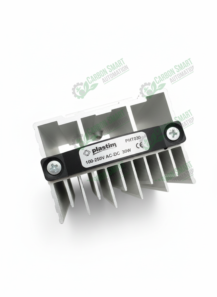 Plastim PHT030 is a self‑regulating 30W PTC enclosure heater designed for DIN rail mounting inside electrical and automation panels. It operates on 100–250 V AC/DC and uses a PTC resistor with overcurrent protection for safe, stable heating. Built with an anodized aluminum heatsink and IP20 protection, it prevents condensation and reduces humidity in switchgear and control cabinets. Suitable for industrial enclosures, ATMs, terminals, and other electronic housings.