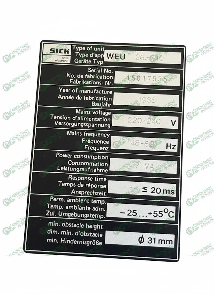 SICK WEU 26-710 is a rugged, high-performance single-beam photoelectric safety receiver designed for access protection in hazardous industrial areas. Operating on a 220/240V AC supply, it is engineered to function reliably in extreme environments, including areas with heavy moisture, heat, or cold. As a “Type 4” safety device, it is typically paired with a WSU 26 sender to create a protective light barrier that triggers a machine shutdown if the beam is interrupted. This model features a durable IP67-rated housing and integrated front screen heating to prevent condensation in fluctuating temperatures.