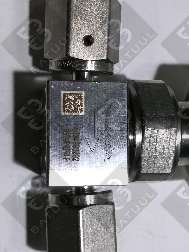 High-precision Swagelok valve (Part #0004993292) featuring a robust stainless steel body and a pneumatic actuator for automated flow control. Designed with integrated tube fittings and a clear flow direction arrow, this industrial-grade component ensures leak-tight performance in high-pressure fluid systems. Includes a unique Data Matrix code for easy digital asset tracking and maintenance.